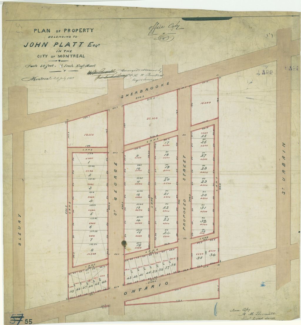 Ce plan présente la propriété de John Platt. Cette propriété est située à l'intérieur du quadrilatère formé par les rues Sherbrooke, Saint-Urbain, Ontario et Saint-George (devenue Jeanne-Mance) à Montréal. Ce sont les lots n° 169 et 170 du cadastre du quartier Saint-Laurent de la cité de Montréal.La rue proposée ne sera jamais réalisée. Les lots ont été subdivisés en 49 lotissements. Monsieur Platt se réserve les portions sur la rue Sherbrooke. Les mesures et les superficies des lotissements sont indiquées