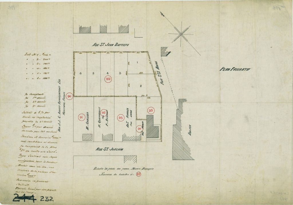 Ce plan présente le lot n° 89 à vendre ainsi que les lots n° 91 à 95 du cadastre de la paroisse de Sainte-Anne sur l'île de Montréal. Ce lot est situé dans le triangle formé par les rues Saint-Joachim, Sainte-Anne et Saint-Jean-Baptiste à Sainte-Anne-de-Bellevue.Le lot n° 89 est subdivisé en 6 lots et une note sur le plan nous apprend les prix de chaque lot et les conditions de vente et de construction d'une résidence. Sont localisés sur les autres lots des résidences qui appartiennent à M. Grassier, H. Quenneville puis P. Beriault, Antoine Ranger puis Monsieur Lahue. L'emplacement de l'église et le nom du voisin, J. J. C. Abbott représentant les héritiers Forbes sont présentés. Les mesures des lots sont indiquées