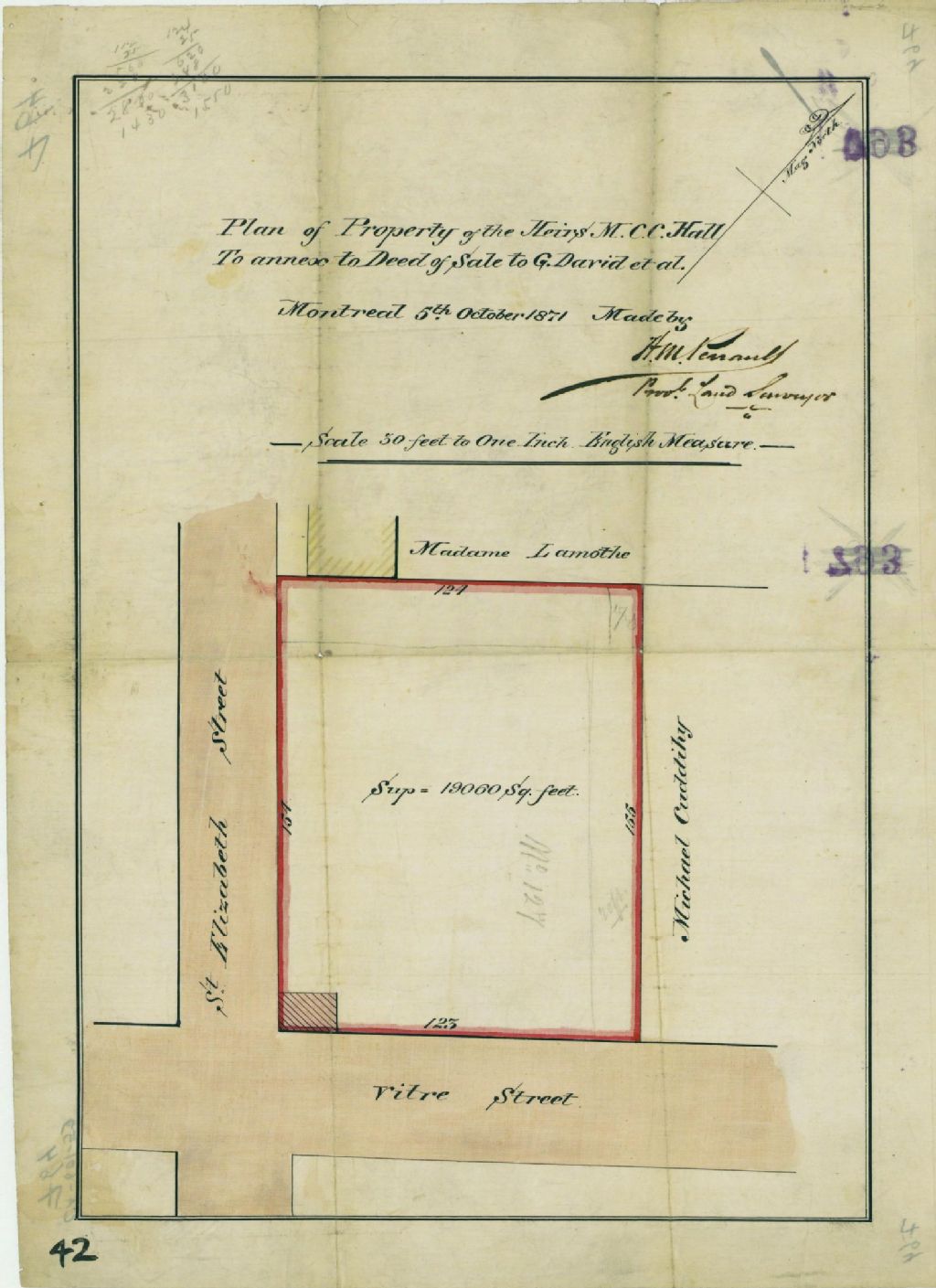 Ce plan présente la propriété appartenant aux héritiers M. C. C. Hall. Cette propriété est située à l'intersection des rues Vitré et Sainte-Élizabeth à Montréal. Il s'agit du lot n° 127 du cadastre du quartier Saint-Louis de la cité de Montréal. Les voisins sont Madame Lamothe et Michael Cuddihy. Les mesures et la superficie du lot sont indiquées