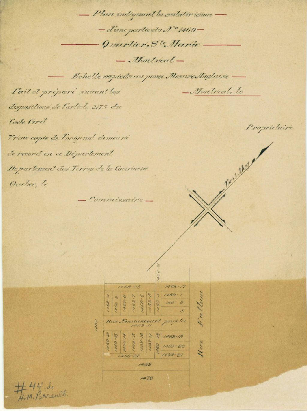 Plan indiquant la subdivision d'une partie du N° 1469 Quartier Ste Marie Montréal