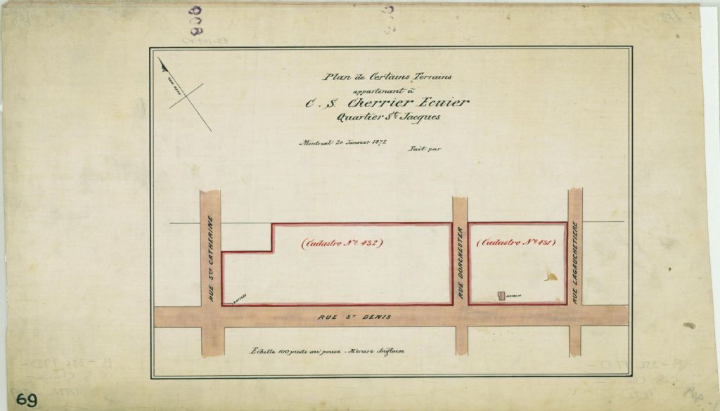 Plan de certains terrains appartenant à C. S. Cherrier Écuier Quartier St-Jacques