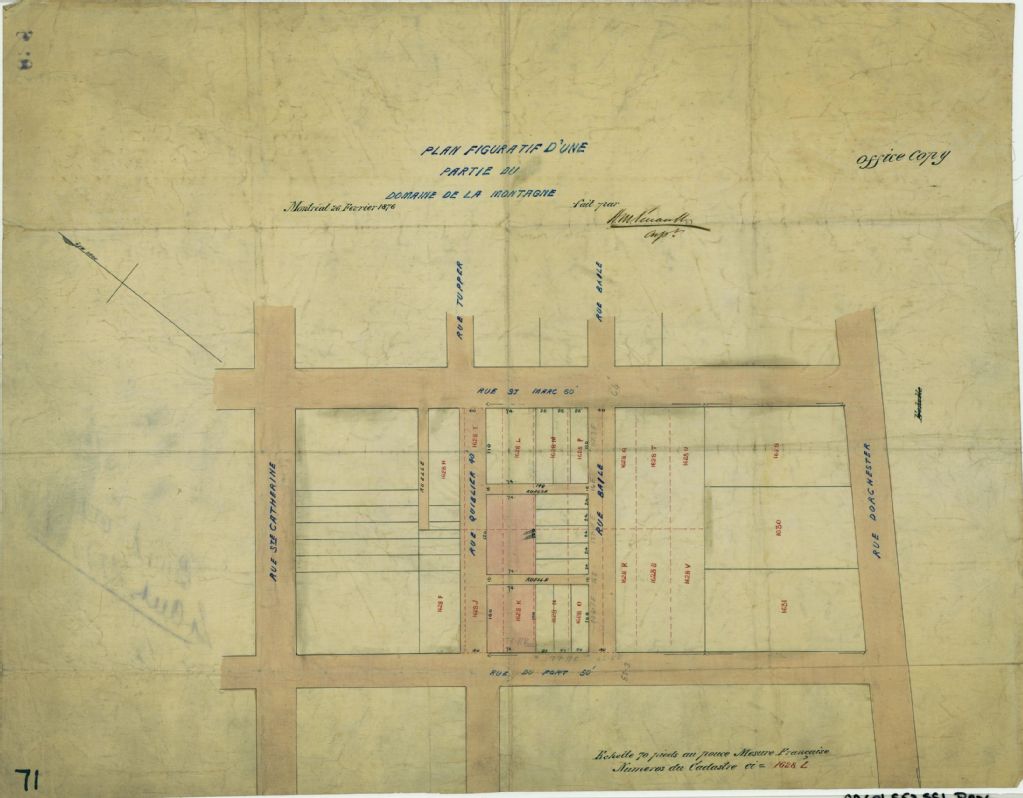 Ce plan présente les lots n° 1628 à 1631 du cadastre du quartier Saint-Antoine de la cité de Montréal. Situés dans le quadrilatère formé par les rues Dorchester (devenue boulevard René-Lévesque), du Fort, Sainte-Catherine et Saint-Marc, les lots ont été subdivisés en lotissements. Les mesures de certains lotissements sont indiquées