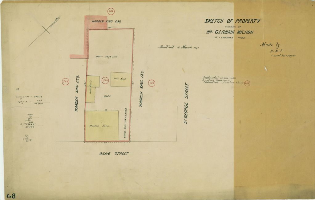 Ce plan présente la propriété appartenant à Germain Michon. Il s'agit du lot n° 753 du cadastre du quartier Saint-Laurent de la cité de Montréal. Le lot est situé sur la rue Craig (devenue Saint-Antoine), près de la rue Saint-George (devenue Jeanne-Mance) à Montréal.Sont localisées sur le lot une maison en bois et deux remises en bois. Le voisin est Warden King. Les mesures et la superficie du lot sont indiquées