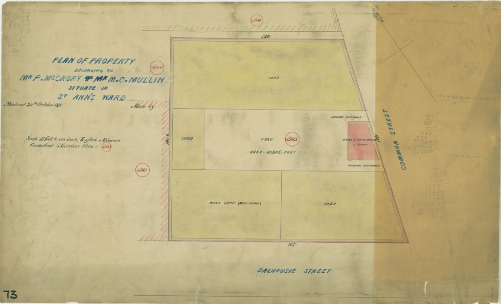 Ce plan présente le lot n° 1503 du cadastre du quartier Sainte-Anne de la cité de Montréal. Le lot appartient à messieurs P. Mc Grory et M. C. Mullin. Il est situé à l'intersection des rues Dalhousie et de la Commune à Montréal.Sont localisés sur le lot une maison de deux étages en brique et pierre, un atelier de moulage et des remises. Les mesures et la superficie du lot sont indiquées