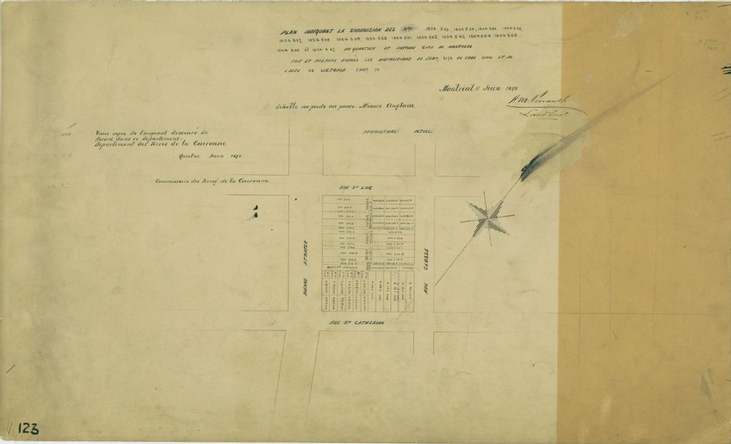 Plan indiquant la subdivision des nos 1654 S53, 1654 S54, 1654 S55, 1654 S56, 1654 S57, 1654 S58, 1654 S59, 1654 S60, 1654 S61, 1654 S62, 1654 S63, 1654 S64, 1654 S65, 1654 S66 et 1654 S67 du quartier St-Antoine Cité de Montréal