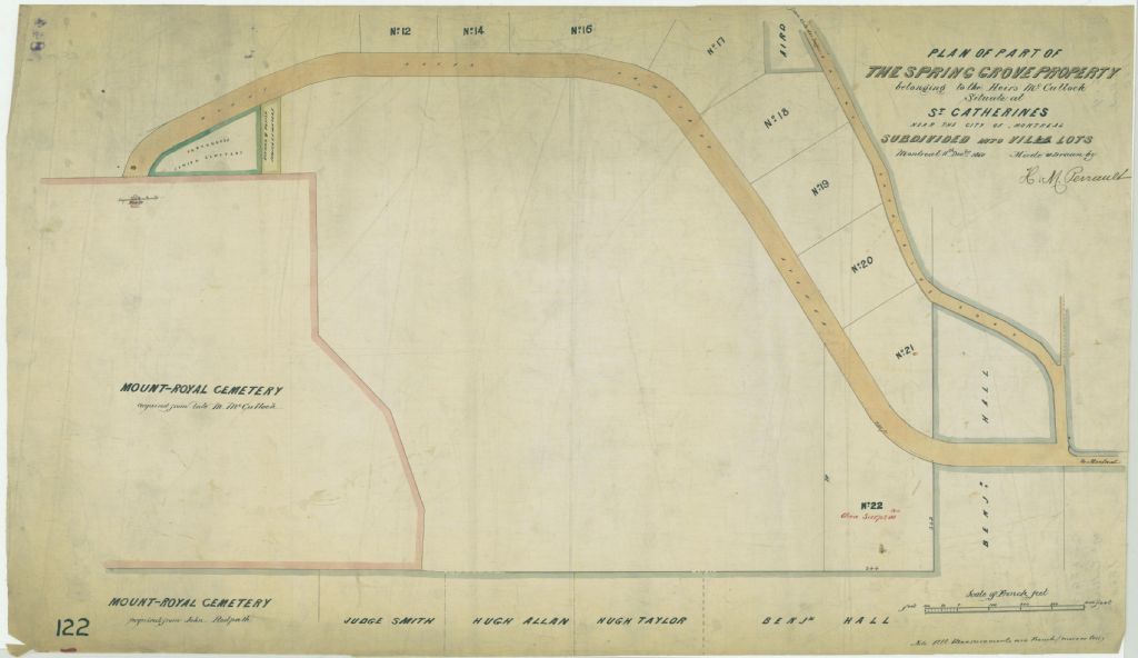 Ce plan présente les lots n° 12, 13 et 16 à 29 du cadastre de la municipalité de la paroisse de Montréal. Ce lots appartiennent aux héritiers McCulloch et sont situés entre la rue Mont-Royal et le Chemin de la Côte-Sainte-Catherine à Outremont.Les voisins sont Benjamin Hall, Hugh Taylor, Hugh Allan, le Juge Smith, le Cimetière du Mont-Royal, le Cimetière juif portugais, le Cimetière juif allemand et Polonais et Monsieur Aird. La superficie d'un lot est indiquée