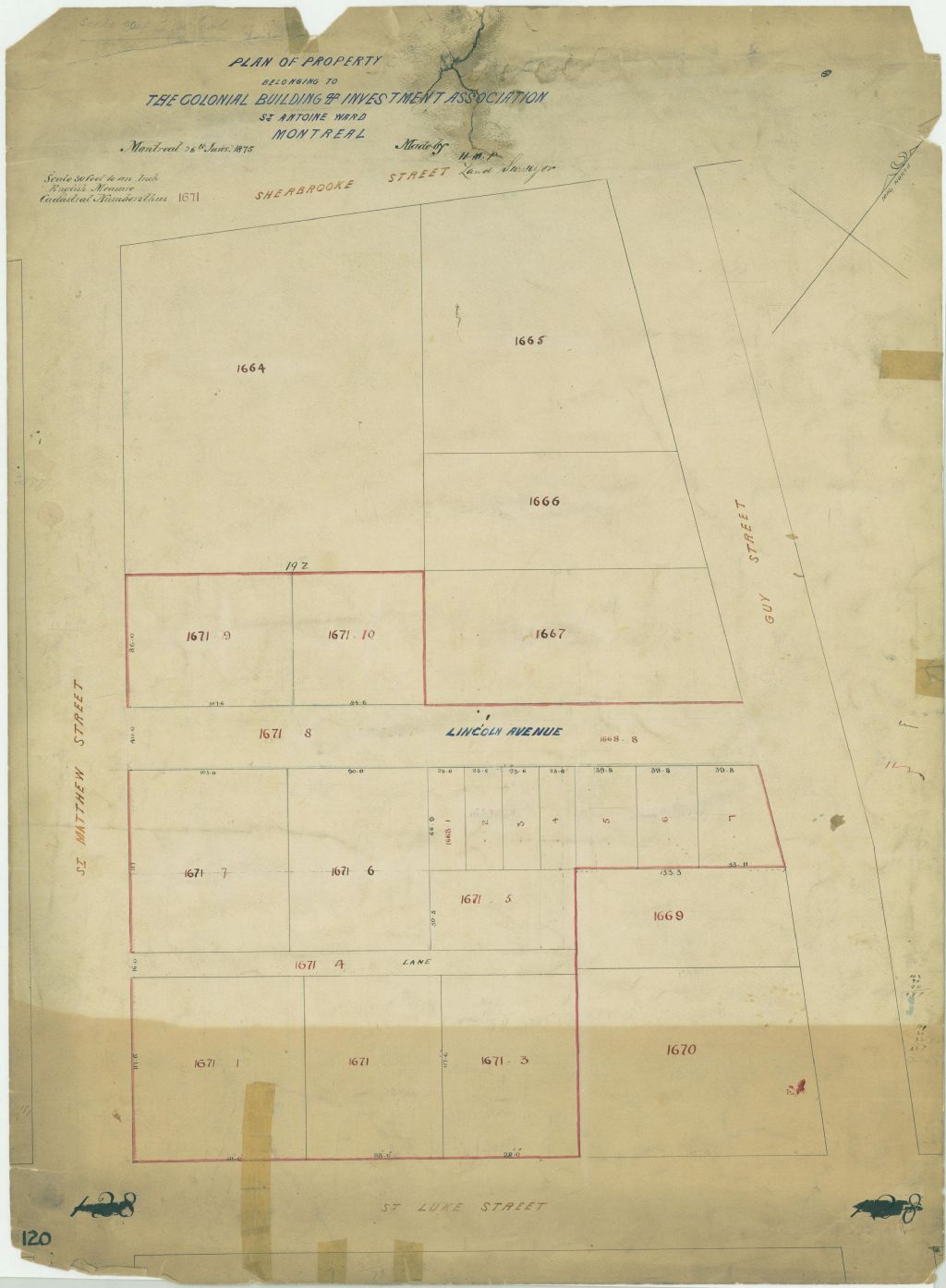 Ce plan présente le lot n° 1671 du cadastre du quartier Saint-Antoine de la cité de Montréal. Le lot est subdivisé en lotissements.Le lot appartient à la Colonial Building & Investment Association. Il est situé dans le quadrilatère formé par les rues Sherbrooke, Guy, Saint-Luc et Saint-Mathieu. Les mesures des lotissements sont indiquées