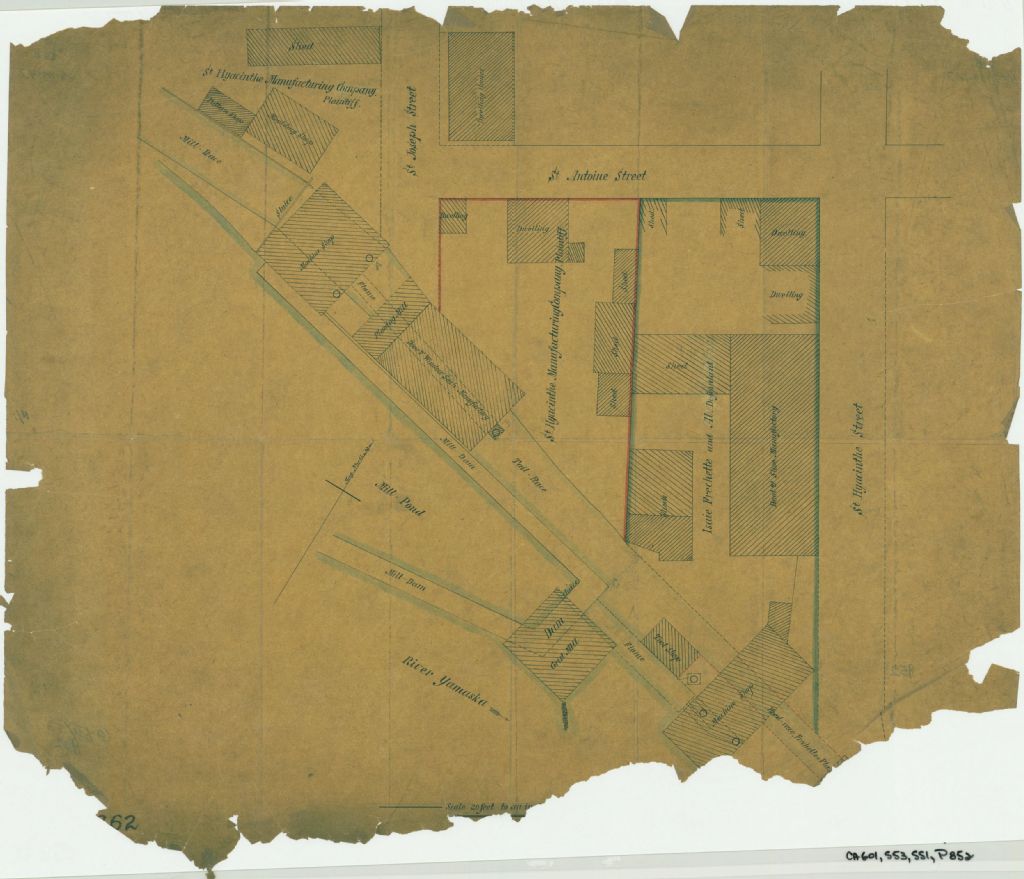 - Ce plan présente les propriétés d'Isaie Fréchette et autres et celles de la St. Hyacinthe Manufacturing Company. Les propriétés sont situées sur la rivière Yamaska entre les rues Saint-Hyacinthe, Saint-Antoine et Saint-Joseph à Saint-Hyacinthe.Sont localisés sur la propriété de Monsieur Fréchette : deux maisons, une manufacture de bottes et souliers, un atelier d'usinage et quatre remises. Sont localisés sur la propriété de la St. Hyacinthe Manufacturing Company : deux maisons, une manufacture de portes et fenêtres, un atelier d'usinage, une usine à rabotage, un atelier de modelage, un atelier à moulage, un atelier d'outils, un moulin à moudre le blé et quatre remises. Un litige est enregistré à la Cour Supérieure de Saint-Hyacinthe entre les deux propriétaires