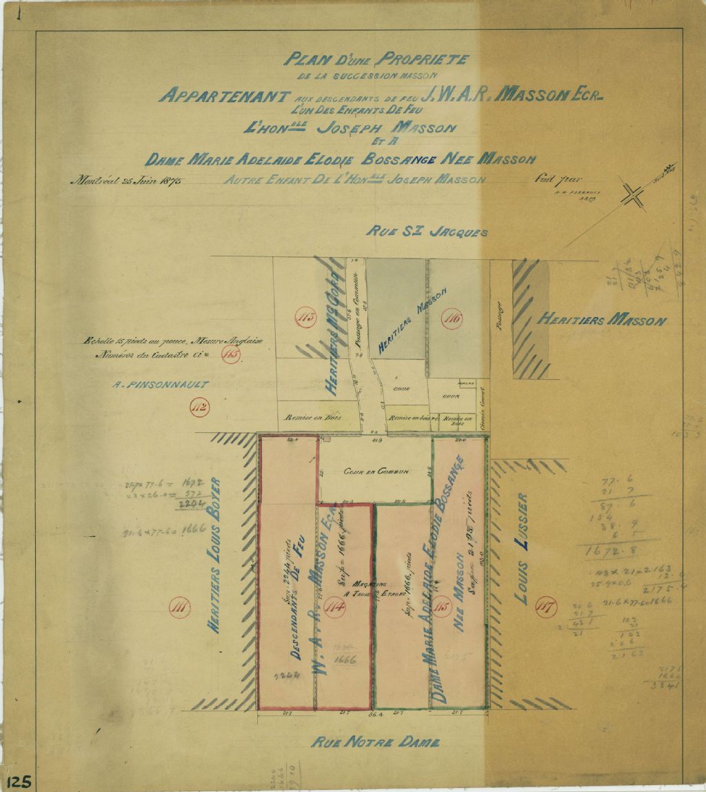 Ce plan présente les lots n° 114 à 116 du cadastre du quartier Centre de la cité de Montréal. Sont localisés sur les lots des magasins à trois étages, d'autres édifices et des remises. Les voisins sont les héritiers de Louis Boyer, les héritiers McCord et Louis Lussier. Les lots n° 114 et 115 sont divisés entre les deux héritiers de feu Joseph Masson. Les mesures et les superficies de ces deux lots sont indiquées