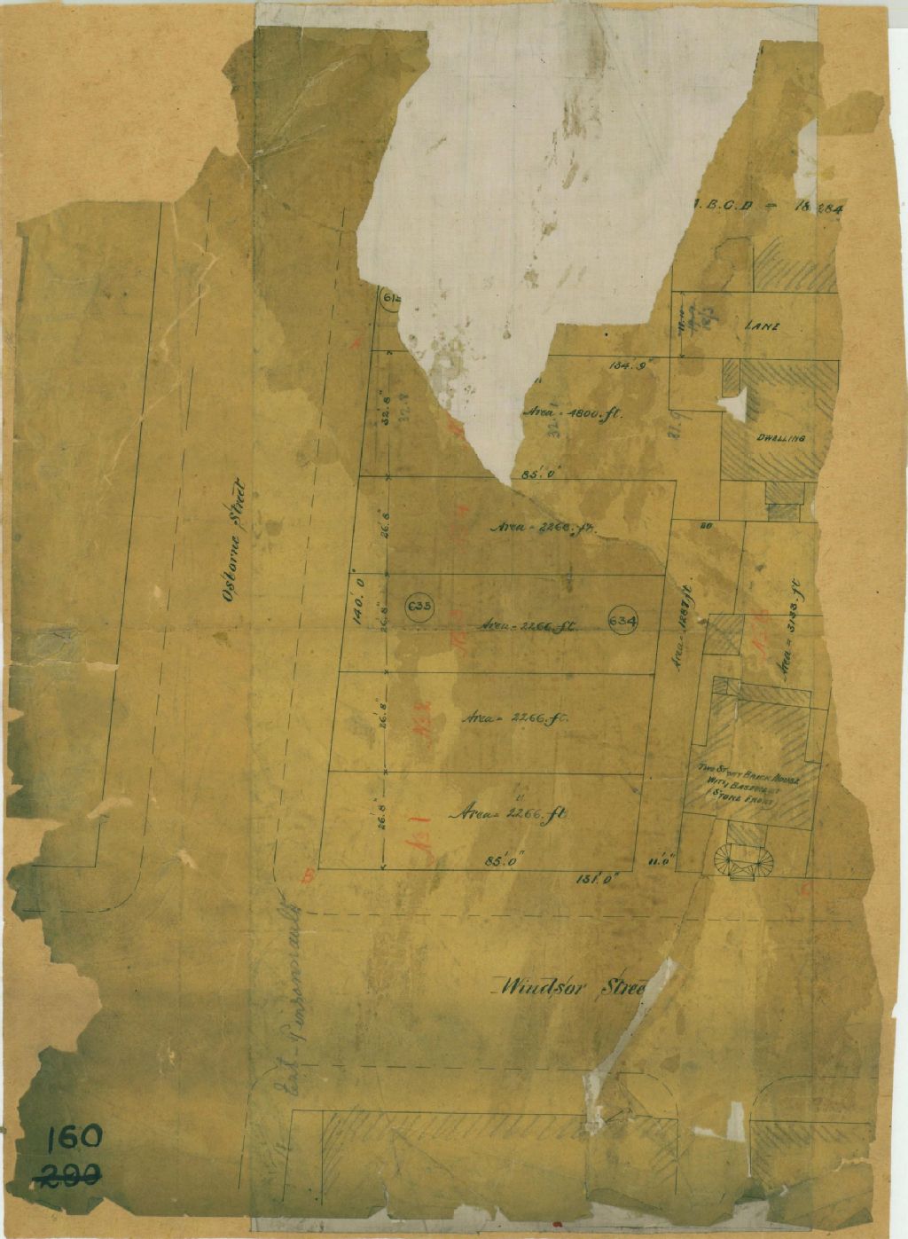 Ce plan présente les lots situés à l'intersection des rues Windsor (devenue Peel) et Osborne (devenue Lagauchetière) à Montréal. Il s'agit des lots n° 634 et 635 du cadastre du quartier Saint-Antoine de la cité de Montréal.Les lots sont subdivisés en lotissements. Sont localisés sur les lots deux maisons et une remise. Les mesures et les superficies sont indiquées