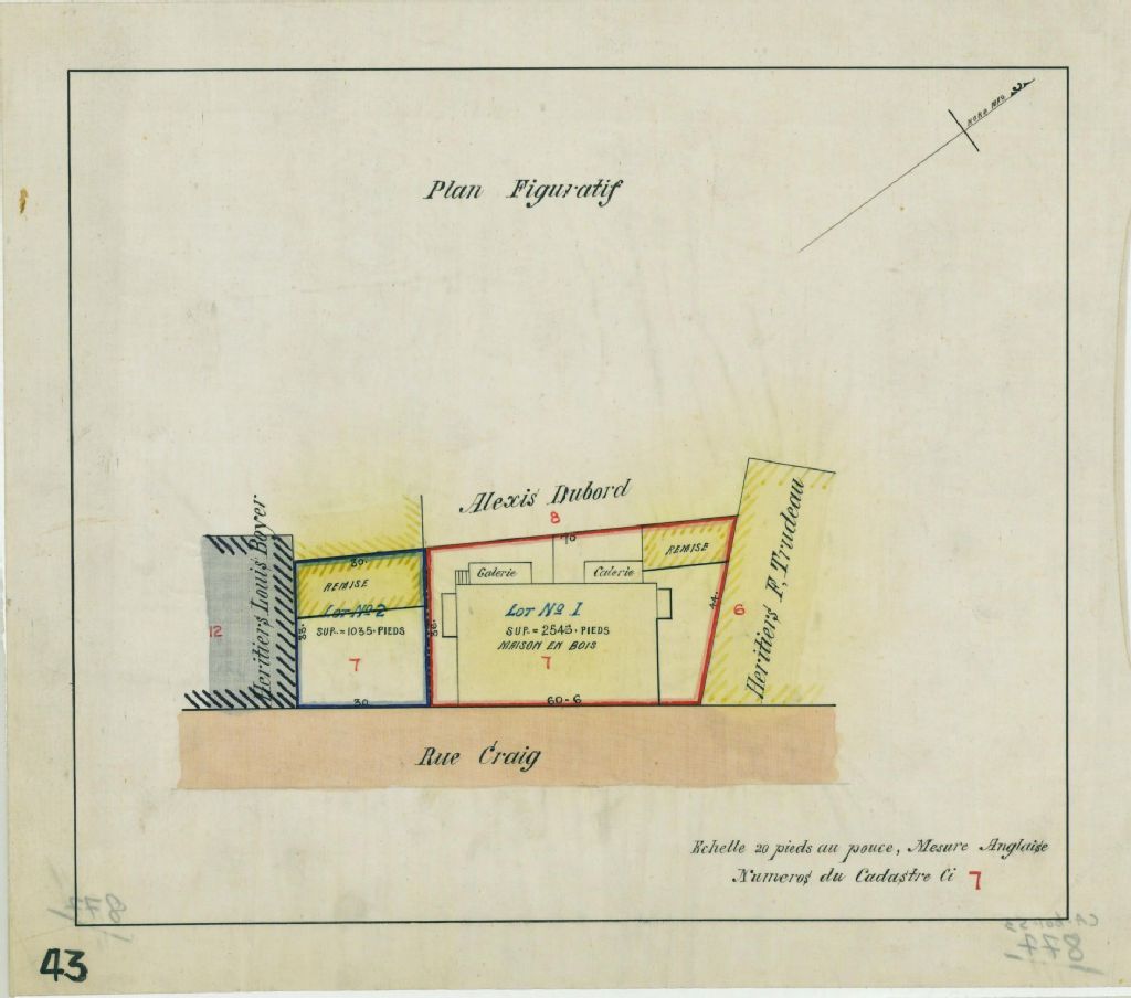 Ce plan présente le lot n° 7 du cadastre du quartier Saint-Louis de la cité de Montréal. Ce lot est situé sur la rue Craig (devenue Saint-Antoine) près du Carré Viger à Montréal.Le lot est divisé en deux parties. Sont localisées sur le lot une maison en bois et deux remises. Les voisins sont les héritiers de Louis Boyer et les héritiers de F. Trudeau. Les mesures et la superficie des deux parties du lot sont indiquées