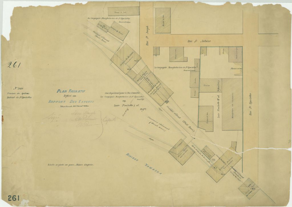 - Ce plan présente les propriétés d'Isaïe Fréchette et autres et celles de La Compagnie Manufacturière de Saint-Hyacinthe. Les propriétés sont situées sur la rivière Yamaska entre les rues Saint-Hyacinthe, Saint-Antoine et Saint-Joseph à Saint-Hyacinthe. Le plan est produit pour la cause opposant La Compagnie Manufacturière de Saint-Hyacinthe vs Isaïe Fréchette. Cette cause est inscrite à la Cour Supérieure de Saint-Hyacinthe au n° 2056.Sont localisés sur la propriété de Monsieur Fréchette : deux maisons, une manufacture de bottes et souliers, un atelier d'usinage, quatre remises et une partie du canal d'irrigation (coursier d'aval ou Tail Race). Sont localisés sur la propriété de La Compagnie Manufacturière de Saint-Hyacinthe : deux maisons, une manufacture de portes et fenêtres, un atelier d'usinage, une usine à rabotage, un atelier de modelage, un atelier à moulage, un atelier d'outils, un moulin à moudre le blé, un canal d'irrigation (coursier d'amont ou Head Race et coursier d'aval ou Tail Race) et quatre remises