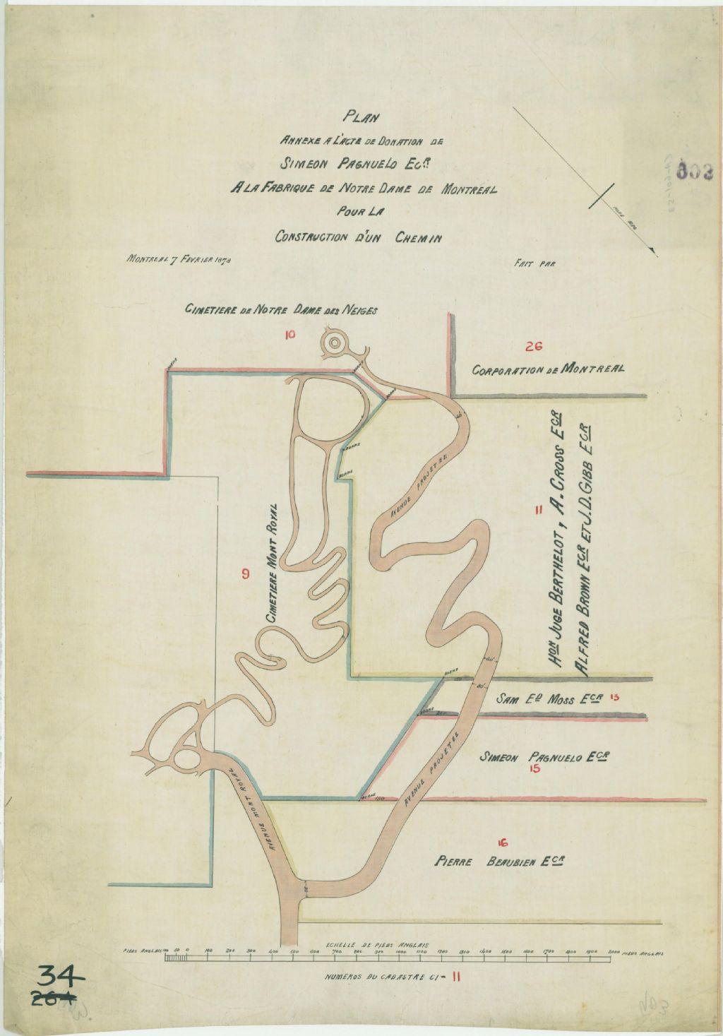 Ce plan présente les lots n° 9 à 16 du cadastre de la municipalité de la paroisse de Montréal. Il s'agit surtout d'une partie du lot n° 10 que Siméon Pagnuelo va donner à la Fabrique de Montréal pour y faire passer un chemin conduisant au cimetière Notre-Dame-des-Neiges.Ce chemin projeté débute à l'avenue Mont Royal, à Outremont, passe à travers les lots appartenant à Pierre Beaubien, Siméon Pagnuelo, Sam Ed. Moss, le Juge Berthelot, A. Cross, Alfred Brown et J. D. Gibb. Les largeurs du chemin proposé sont indiquées