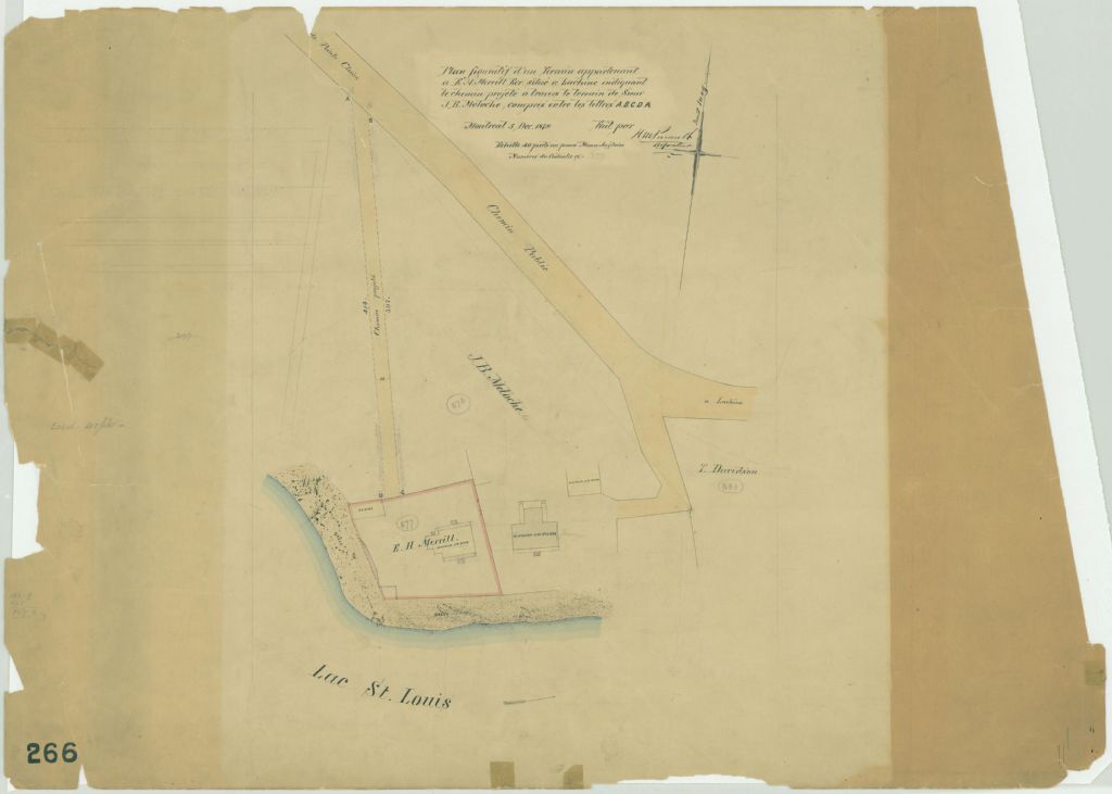 Ce plan présente les lots n° 877 et 878 du cadastre de la paroisse de Lachine sur l'île de Montréal. Ces lots sont situés entre le Public Road (devenu le Chemin du Bord du Lac) et le lac Saint-Louis à Lachine.Sont localisées sur le lot de E. H. Merrill : une maison en bois et une remise; sur le lot de J. B. Meloche : deux maisons, une en pierre et une en bois. Les mesures du chemin proposé sont indiquées