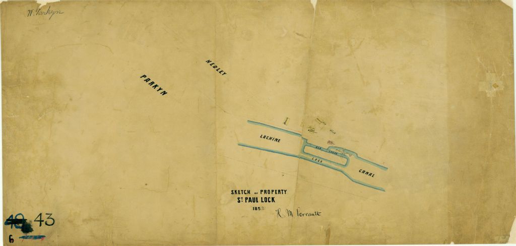 Ce plan présente l'écluse Saint-Paul, sur la Canal Lachine. Ce sont les lots n° 3413 à 3415 du cadastre de la municipalité de la paroisse de Montréal. L'ancienne et la nouvelle écluse sont indiquées ainsi que la prise d'eau, traversée par un pont conduisant à l'îlot central de l'écluse. Les résidences du maître de l'écluse et des employés de l'écluse, quelques hangars et une grange sont localisés. Les propriétaires des lots voisins sont Messieurs Parkyn et Hedley