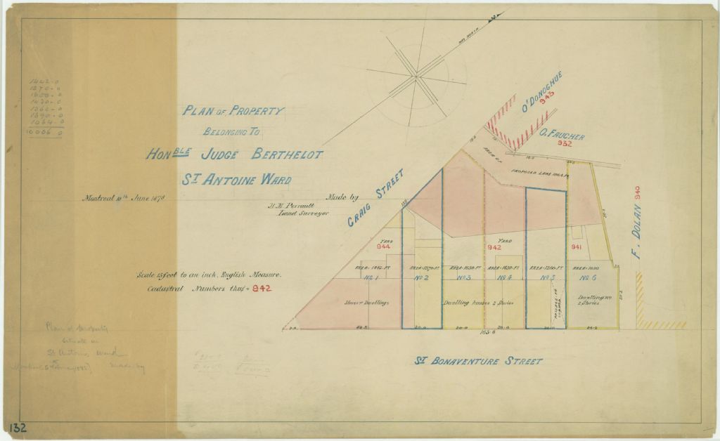 Ce plan présente les lots n° 941 à 944 du cadastre du quartier Saint-Antoine de la cité de Montréal. Ces lots appartiennent au Juge Berthelot. Ils sont situés à l'intersection des rues Saint-Bonaventure (devenue Saint-Jacques) et Craig (devenue Saint-Antoine) à Montréal.Sont localisés sur les lots des magasins et résidences et des résidences de deux étages. Un espace est prévu pour un passage en commun. Les mesures et la superficies des lots sont indiquées