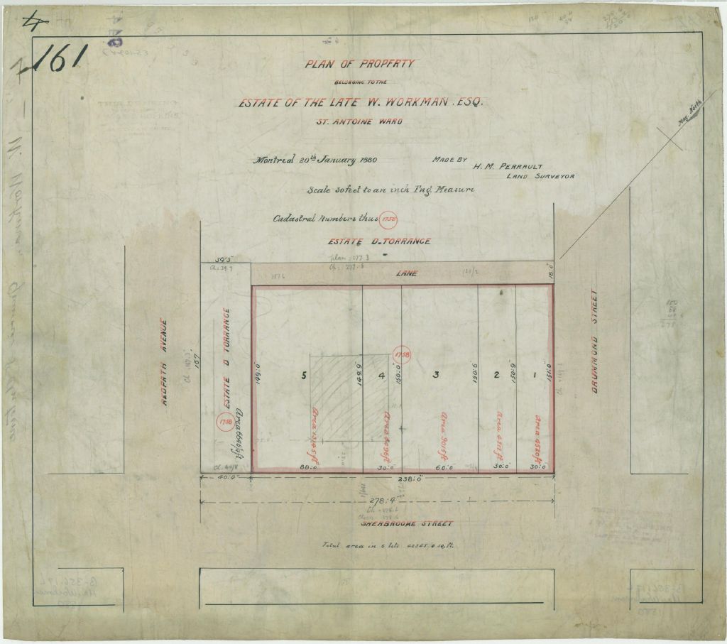 Ce plan présente le lot n° 1758 du cadastre du quartier Saint-Antoine de la cité de Montréal. Le lot appartient à la succession de feu W. Workman. Le lot est situé sur la rue Sherbrooke entre les rues Redpath et Drummond à Montréal. Le lot est subdivisé en 6 lotissements.Le voisin est la succession de feu D. Torrance laquelle possède aussi une portion du lot n° 1758. Les mesures et les superficies des lotissements sont indiquées