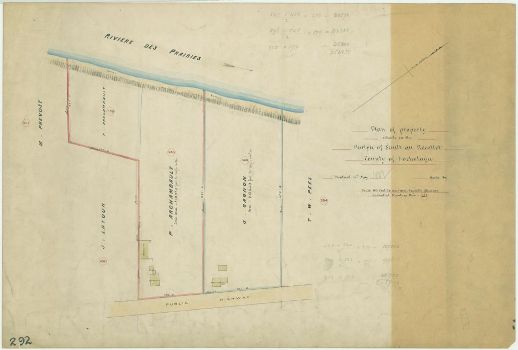 Ce plan présente les lots n° 255 et 258 du cadastre de la paroisse du Sault-au-Récollet sur l'île de Montréal. Situés entre le chemin public (devenu boulevard Gouin) et la rivière des Prairies, ces lots appartiennent à S. Gagnon et P. Archambault.Sont localisés sur ces lots la résidence et les dépendances de S. Gagnon ainsi que la résidence et l'étable de P. Archambault. Les voisins sont T. W. Peel, J. Latour et M. Prévost. Les mesures et les superficies des lots sont indiquées