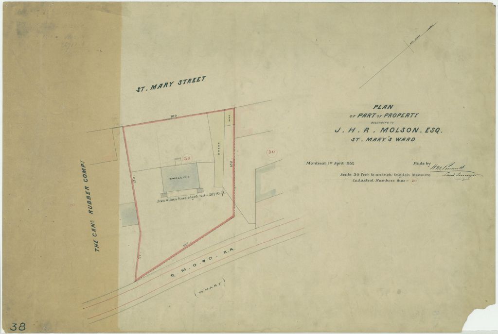 Ce plan présente une partie de la propriété appartenant à monsieur J. H. R. Molson. Il s'agit d'une partie du lot n° 30 du cadastre du quartier Sainte-Marie de la cité de Montréal. Ce lot est situé sur la rue Sainte-Marie (devenue Notre-Dame) à Montréal.Sont localisées sur le lot la résidence et deux remises. Le voisin est The Canadian Rubber Company. La compagnie de chemin de fer Q. M. O. & O. longe le lot près du quai du port de Montréal. Les mesures et la superficie de la partie du lot sont indiquées