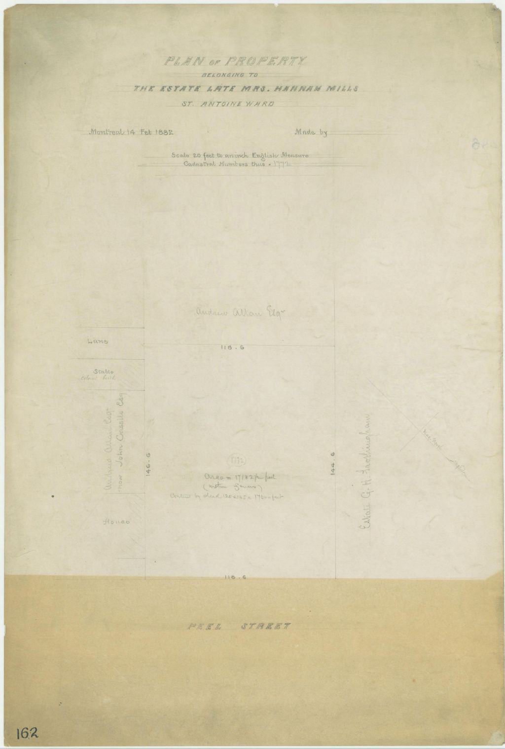 Ce plan présente le lot n° 1172 du cadastre du quartier Saint-Antoine de la cité de Montréal. Ce lot appartient à la succession de feu madame Hannah Mills. Il est situé sur la rue Peel à Montréal.Les voisins sont John Cassils, Andrew Allan et la succession G. H. Frothingham. Les mesures et la superficie du lot sont indiquées