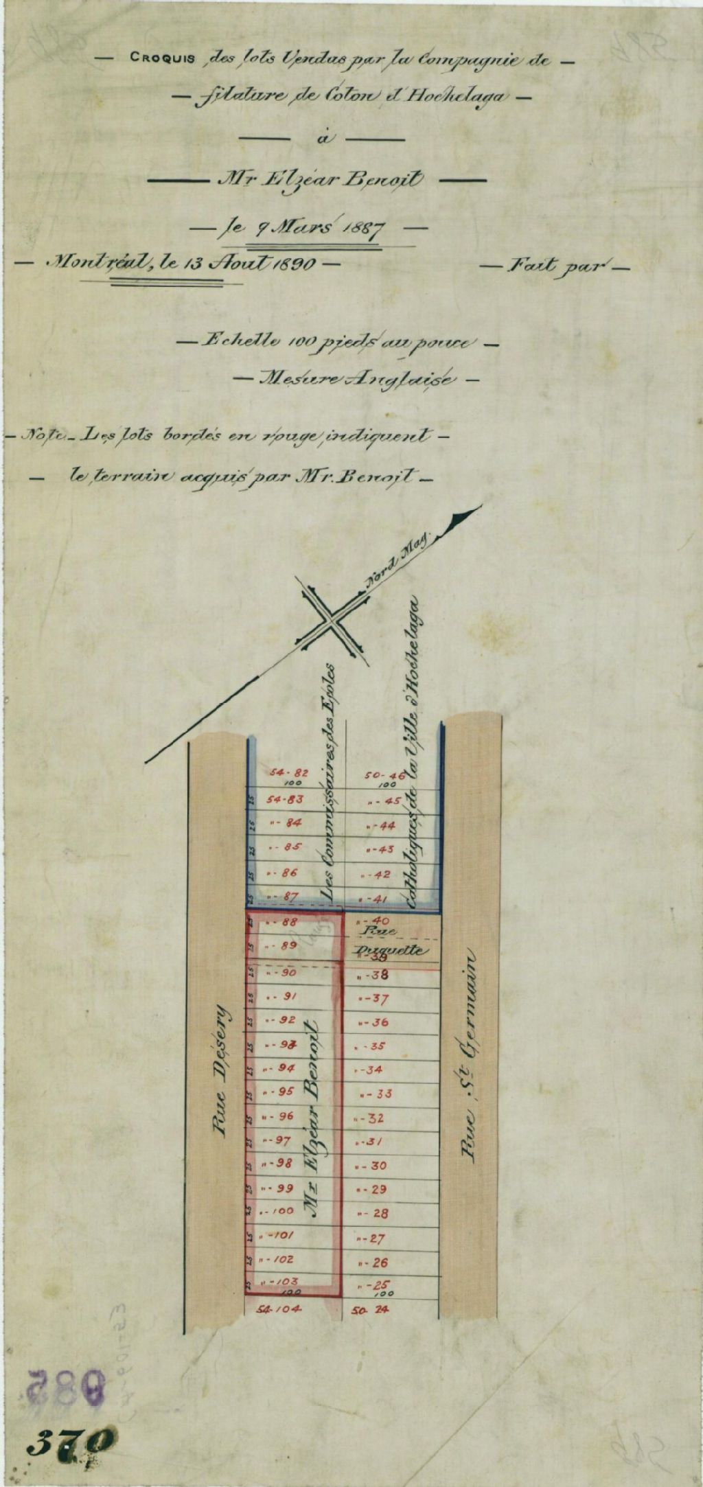 Croquis des lots Vendus par la Compagnie de filature de Coton d'Hochelaga à J. Elzéard Benoit le 9 mars 1887