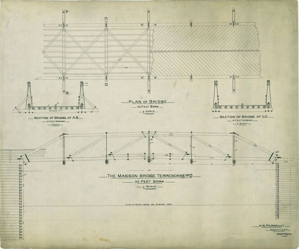 The Masson Bridge Terrebonne P. Q, [Vers 18 août 1885], Archives nationales à Montréal, Fonds Cour supérieure. District judiciaire de Montréal. Greffes d'arpenteurs, (06M,CA601,S53,SS3,P1404), H. M. Perrault.
