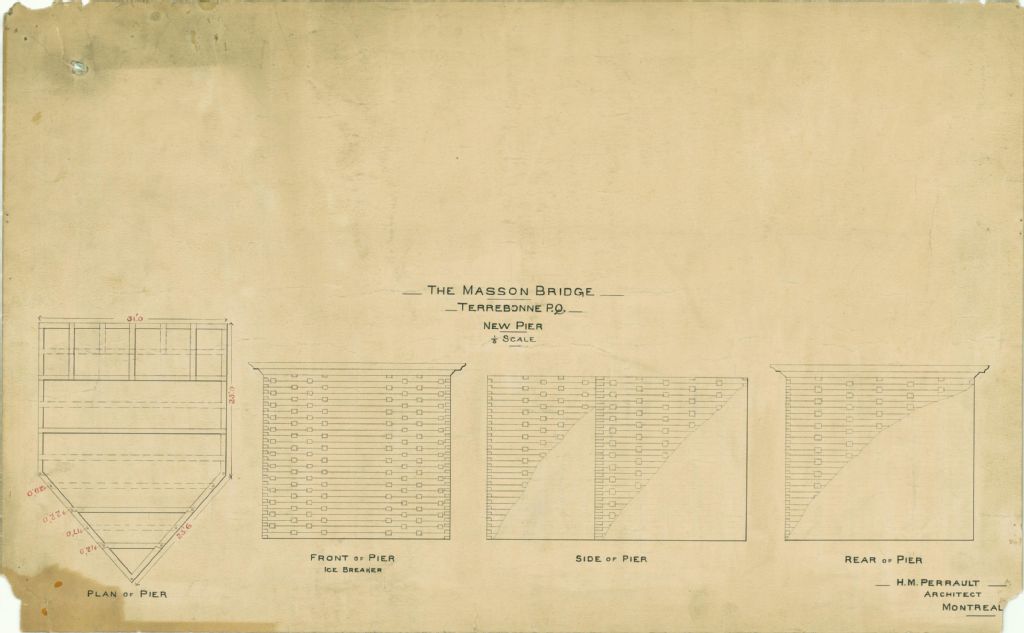 The Masson Bridge Terrebonne P. Q. New Pier, [Vers 18 août 1885], Archives nationales à Montréal, Fonds Cour supérieure. District judiciaire de Montréal. Greffes d'arpenteurs, (06M,CA601,S53,SS3,P1405), H. M. Perrault.