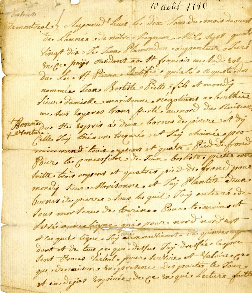 Procès-verbal de bornage, à la requête de Jean Baptiste Piette, fils, A. Mondy et Sieur Danielle Morisonne, négociants de Berthier, d'un emplacement situé au Nord du ruisseau Bonne Aventure, 10 août 1790, Archives nationales à Montréal, Fonds Cour supérieure. District judiciaire de Montréal. Greffes d'arpenteurs, (06M,CA601,S55,SS1,D1).