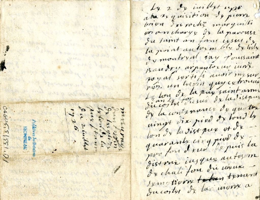 Procès-verbal de mesurage, à la requête de Pierre Brien Desroché, marguillier en charge de la paroisse du Saint-Enfant-Jésus-de-la-Pointe-aux-Trembles, d'un terrain sur la rue Sainte-Anne, 2 juillet 1726, Archives nationales à Montréal, Fonds Cour supérieure. District judiciaire de Montréal. Greffes d'arpenteurs, (06M,CA601,S5,SS1,D1).