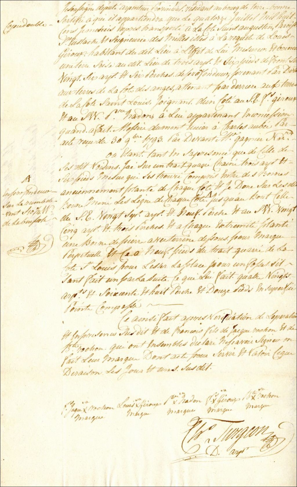 Procès-verbal de mesurage et de bornage, à la requête de Louis Giroux, d'une terre située à la Côte-Saint-Augustin dans la paroisse de Saint-Eustache, seigneurie des Mille-Îles, 14 juillet 1800, Archives nationales à Montréal, Fonds Cour supérieure. District judiciaire de Montréal. Greffes d'arpenteurs, (06M,CA601,S61,SS1,D13).