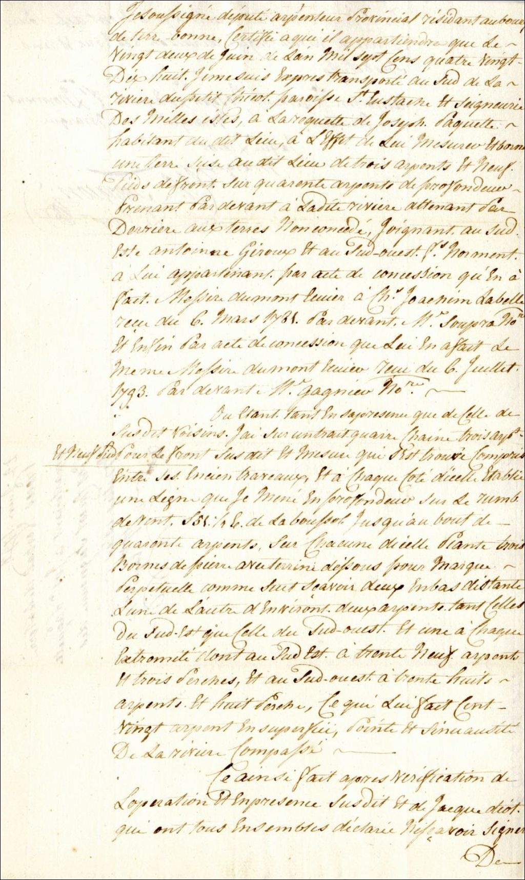 Procès-verbal de mesurage et de bornage, à la requête de Joseph Paquette, d'une terre située au Sud de la rivière du Petit Chicot dans la paroisse de Saint-Eustache, seigneurie des Mille-Îles, 22 juin 1798, Archives nationales à Montréal, Fonds Cour supérieure. District judiciaire de Montréal. Greffes d'arpenteurs, (06M,CA601,S61,SS1,D3).