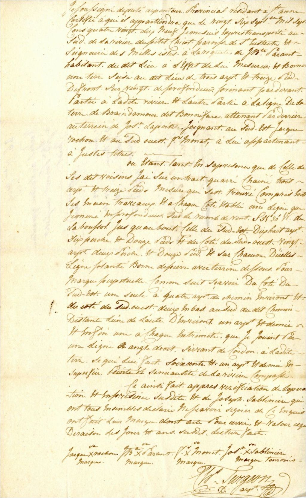 Procès-verbal de mesurage et de bornage, à la requête de Jean Baptiste Parant, d'une terre située au Sud de la rivière du Petit Chicot dans la paroisse de Saint-Eustache, seigneurie des Mille-Îles
