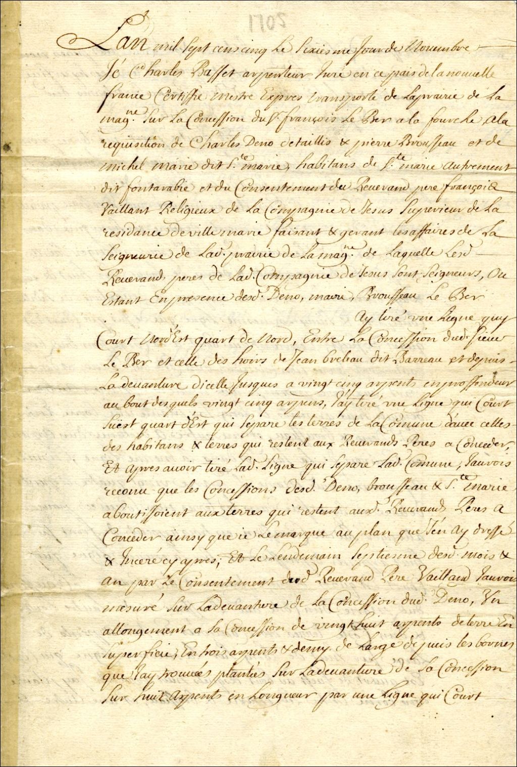 Procès-verbal de mesurage et de bornage, à la requête de Charles Deno Detaillis, Pierre Brosseau et Michel Marie dit Sainte-Marie et du consentement du Père François Vaillant, Supérieur de la résidence de Ville-Marie de la Compagnie du Jésus, de la concession du sieur François Le Ber à la côte Sainte-Marie dit Fontarabie dans la seigneurie de Laprairie