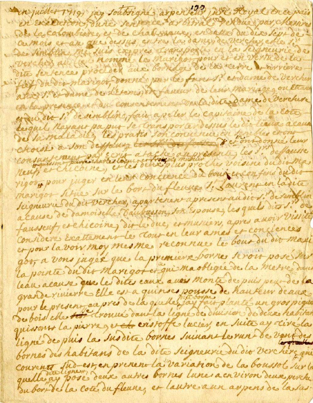 Procès-verbal de bornage, à la suite d'une sentence rendue par Messieurs de la Colombière et de Chaumaux dans le litige opposant Madame de Vercher et le Sieur de Simblin, d'une terre dans la seigneurie de Verchères au lieu nommé le Marigor, 21 juillet 1719, Archives nationales à Montréal, Fonds Cour supérieure. District judiciaire de Montréal. Greffes d'arpenteurs, (06M,CA601,S6,SS1,D13).
