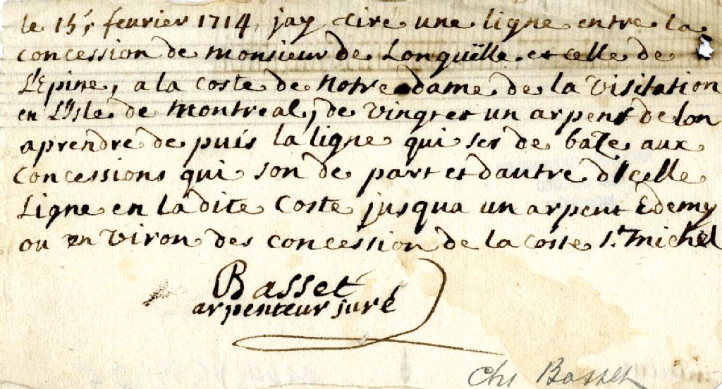 Procès-verbal relatif à la ligne entre la concession de Monsieur de Longuëlle et celle de Monsieur de L'Épine à la côte de Notre-Dame-de-la-Visitation sur l'île de Montréal, 15 février 1714, Archives nationales à Montréal, Fonds Cour supérieure. District judiciaire de Montréal. Greffes d'arpenteurs, (06M,CA601,S6,SS1,D5).