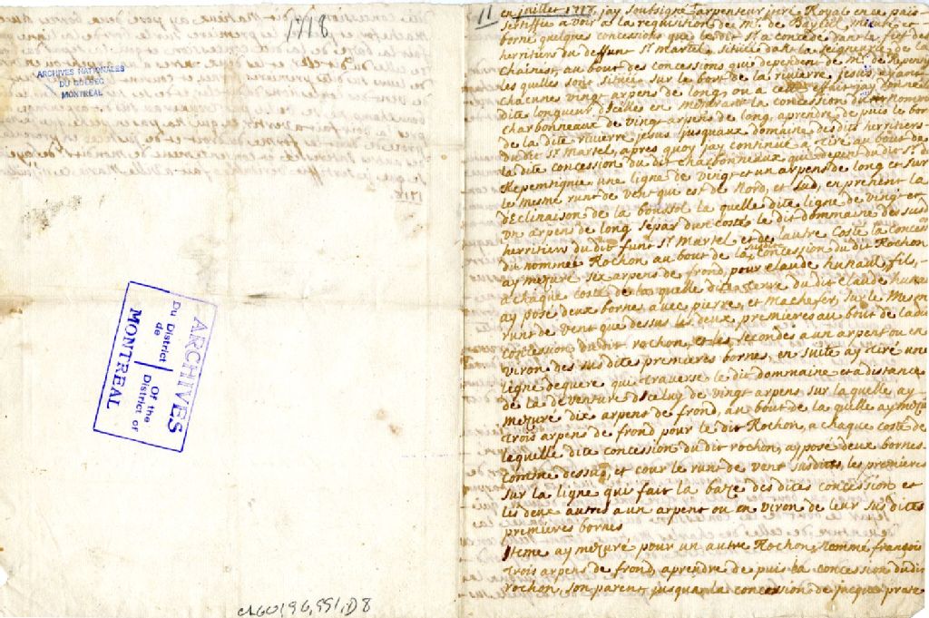 Procès-verbal de mesurage et de bornage, à la requête de Monsieur de Bayeul, de concessions concédées dans le fief des héritiers du défunt Sieur Martel et situées dans la seigneurie de Lachenaie, au bout des concessions qui dépendent de Monsieur de Repentigny sur le bord de la rivière Jésus, 11 juillet 1718, Archives nationales à Montréal, Fonds Cour supérieure. District judiciaire de Montréal. Greffes d'arpenteurs, (06M,CA601,S6,SS1,D8).