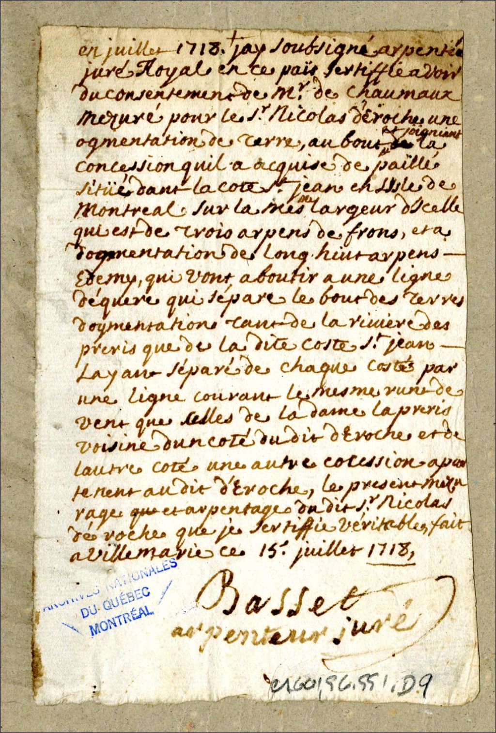 Procès-verbal de mesurage, à la suite du consentement de Monsieur de Chaumaux, d'une augmentation de terre acquise par Nicolas Déroche sur la côte Saint-Jean sur l'île de Montréal, 15 juillet 1718, Archives nationales à Montréal, Fonds Cour supérieure. District judiciaire de Montréal. Greffes d'arpenteurs, (06M,CA601,S6,SS1,D9).