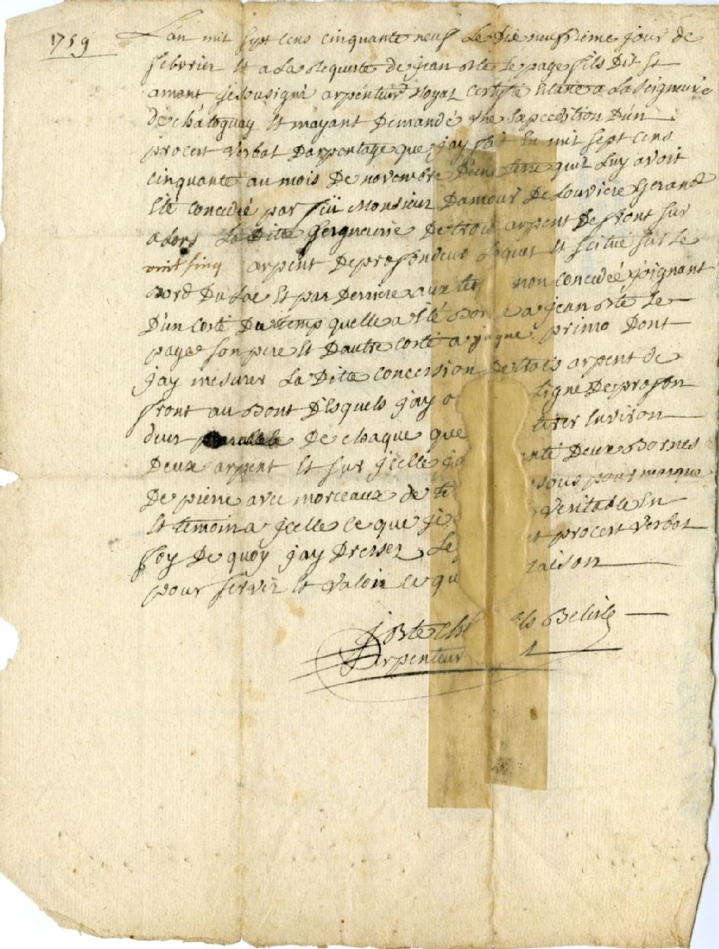 Procès-verbal d'arpentage, à la requête de Jean-Baptiste Lepage dit Saint-Amant, fils, d'un emplacement situé dans la seigneurie de Châteauguay, 19 février 1759, Archives nationales à Montréal, Fonds Cour supérieure. District judiciaire de Montréal. Greffes d'arpenteurs, (06M,CA601,S8,SS1,D16).