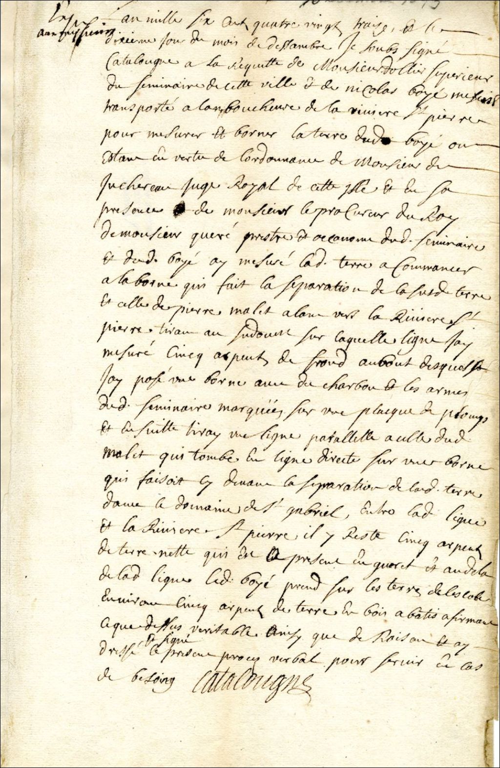 Procès-verbal de mesurage et de bornage, en vertu de l'ordonnance du Sieur de Juchereau, juge royal, et à la requête de François Dollier de Casson, Supérieur du Séminaire de Montréal, et de Nicolas Boyé, d'un emplacement situé à l'embouchure de la rivière Saint-Pierre et appartenant au dit Boyé, 10 décembre 1693, Archives nationales à Montréal, Fonds Cour supérieure. District judiciaire de Montréal. Greffes d'arpenteurs, (06M,CA601,S9,SS1,D12).