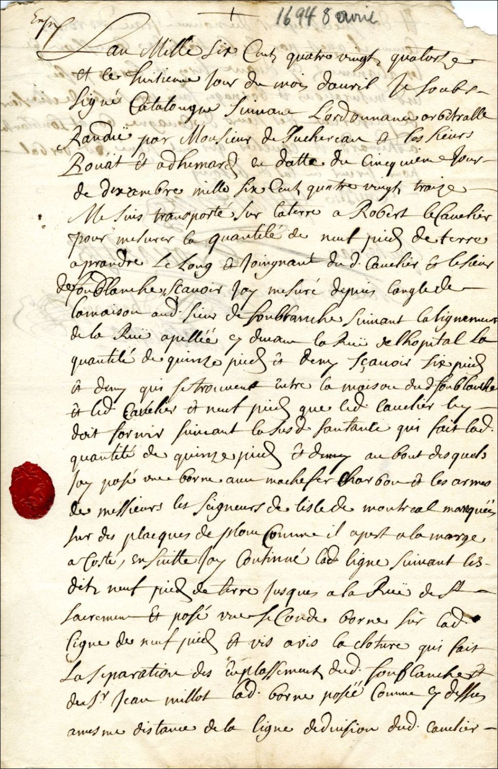 Procès-verbal de mesurage, suivant l'ordonnance rendue par Monsieur de Juchereau et les Sieurs Bouat et Adhémar, sur la terre de Robert Le Cavelier située sur la rue de l'Hôpital à Montréal, 8 avril 1694, Archives nationales à Montréal, Fonds Cour supérieure. District judiciaire de Montréal. Greffes d'arpenteurs, (06M,CA601,S9,SS1,D16).