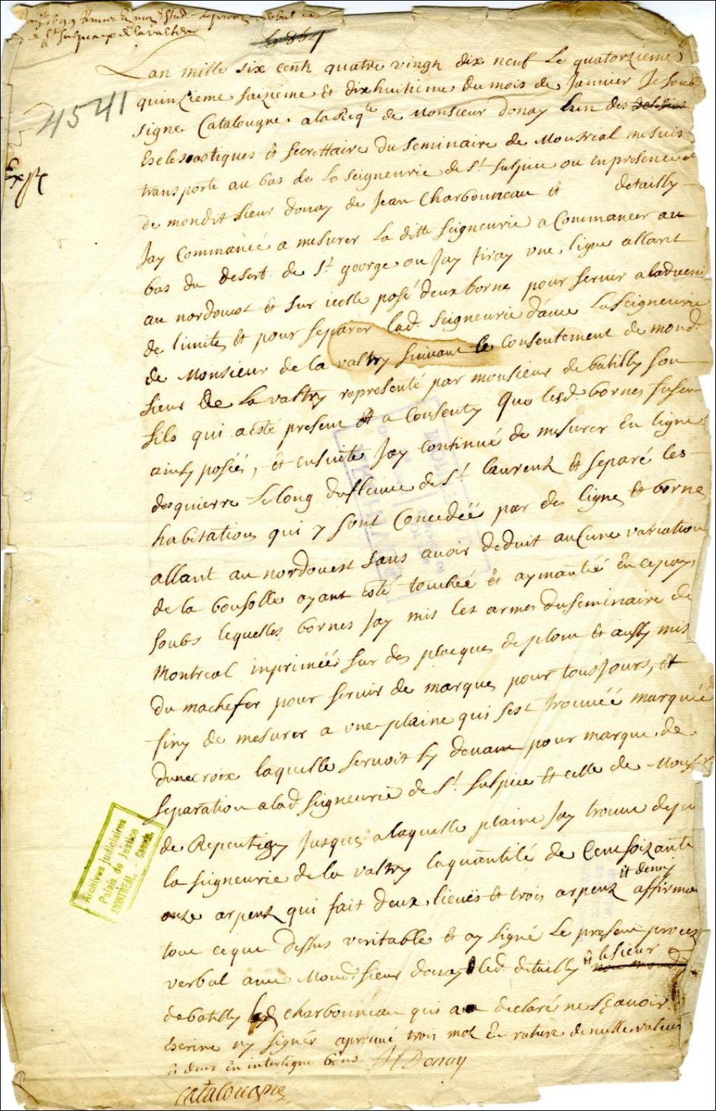Procès-verbal de mesurage, à la requête de Monsieur Donay, l'un des ecclésiastiques du Séminaire de Montréal, des terres des seigneuries de Saint-Sulpice et de Lavaltrie, 18 janvier 1699, Archives nationales à Montréal, Fonds Cour supérieure. District judiciaire de Montréal. Greffes d'arpenteurs, (06M,CA601,S9,SS1,D28).