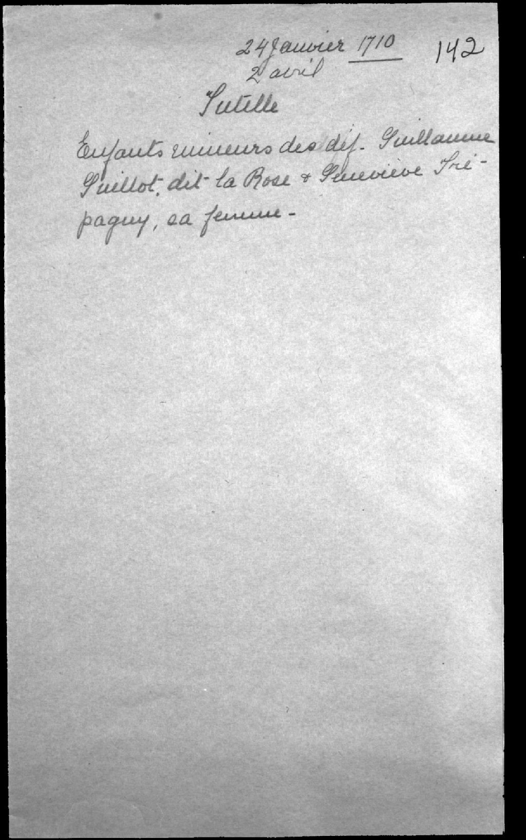 Acte par lequel Charles Guillot est élu tuteur de ses frères et soeurs mineurs issus du mariage de feu Guillaume Guillot dit Larose et de Geneviève Trépagny (Trépagnier, Trépanier), 24 janvier 1710, Archives nationales à Québec, Fonds Cour supérieure. District judiciaire de Québec. Tutelles et curatelles, (03Q,CC301,S1,D142).