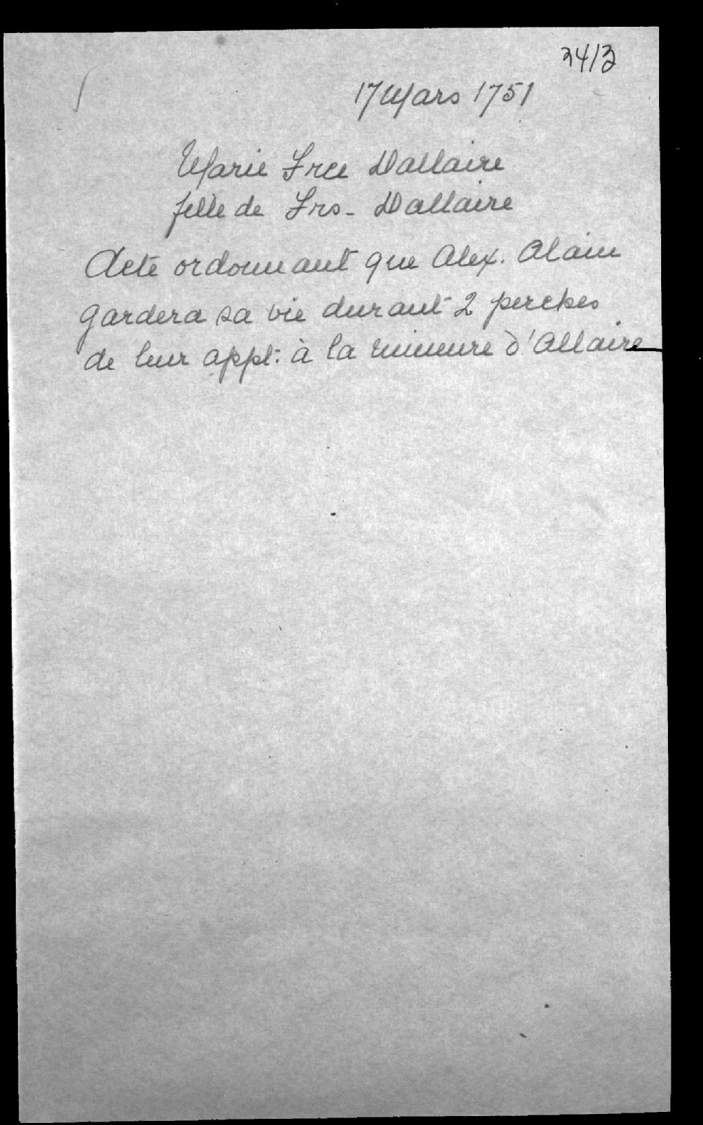 - Acte ordonnant que Alexandre Alain gardera sa vie durant deux perches de terre appartenant à Marie-Françoise D'Allaire (Allaire, Dallaire), fille mineure de feu François D'Allaire (Allaire, Dallaire) et de feue Madeleine Denis