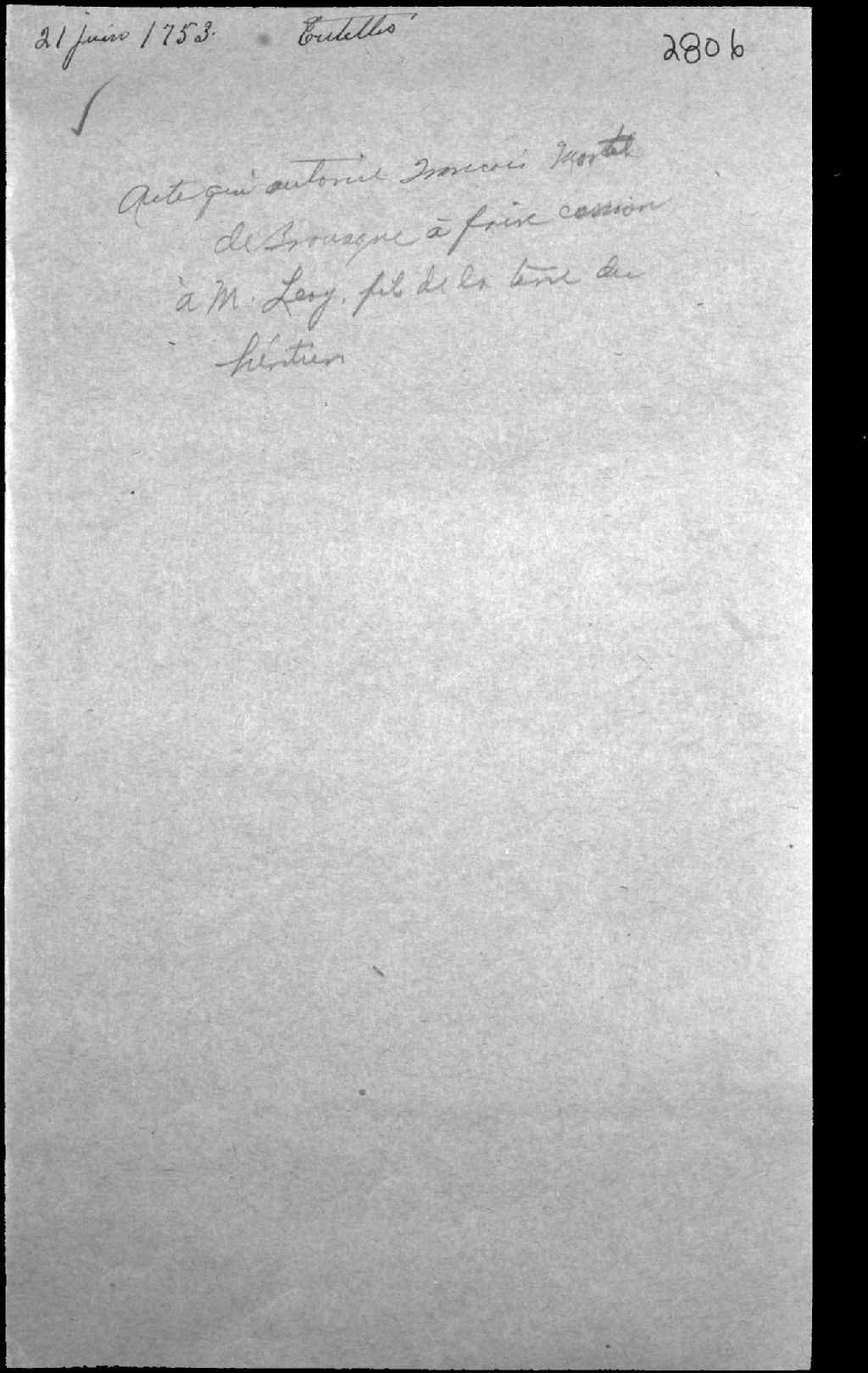 - Acte qui autorise à faire cession à monsieur Léry par monsieur de François Martel de Brouague (Berhouague), commandant des troupes au Labrador, et feue Louise Mariauchaux Desgly (Mariauchau d'Esgly)