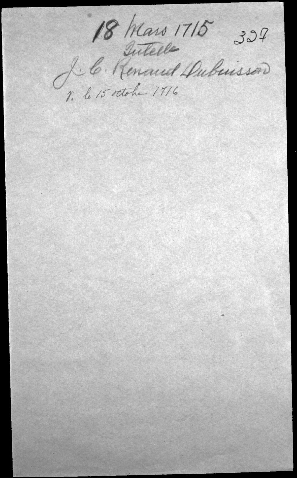Apposition des scellés sur les biens et effets de Jacques-Charles Renaud dit Dubuisson, capitaine d'une compagnie de la Marine et de feue Gabrielle-Michelle Pinet (Desmarais, Dutourel), 18 mars 1715, Archives nationales à Québec, Fonds Cour supérieure. District judiciaire de Québec. Tutelles et curatelles, (03Q,CC301,S1,D327).