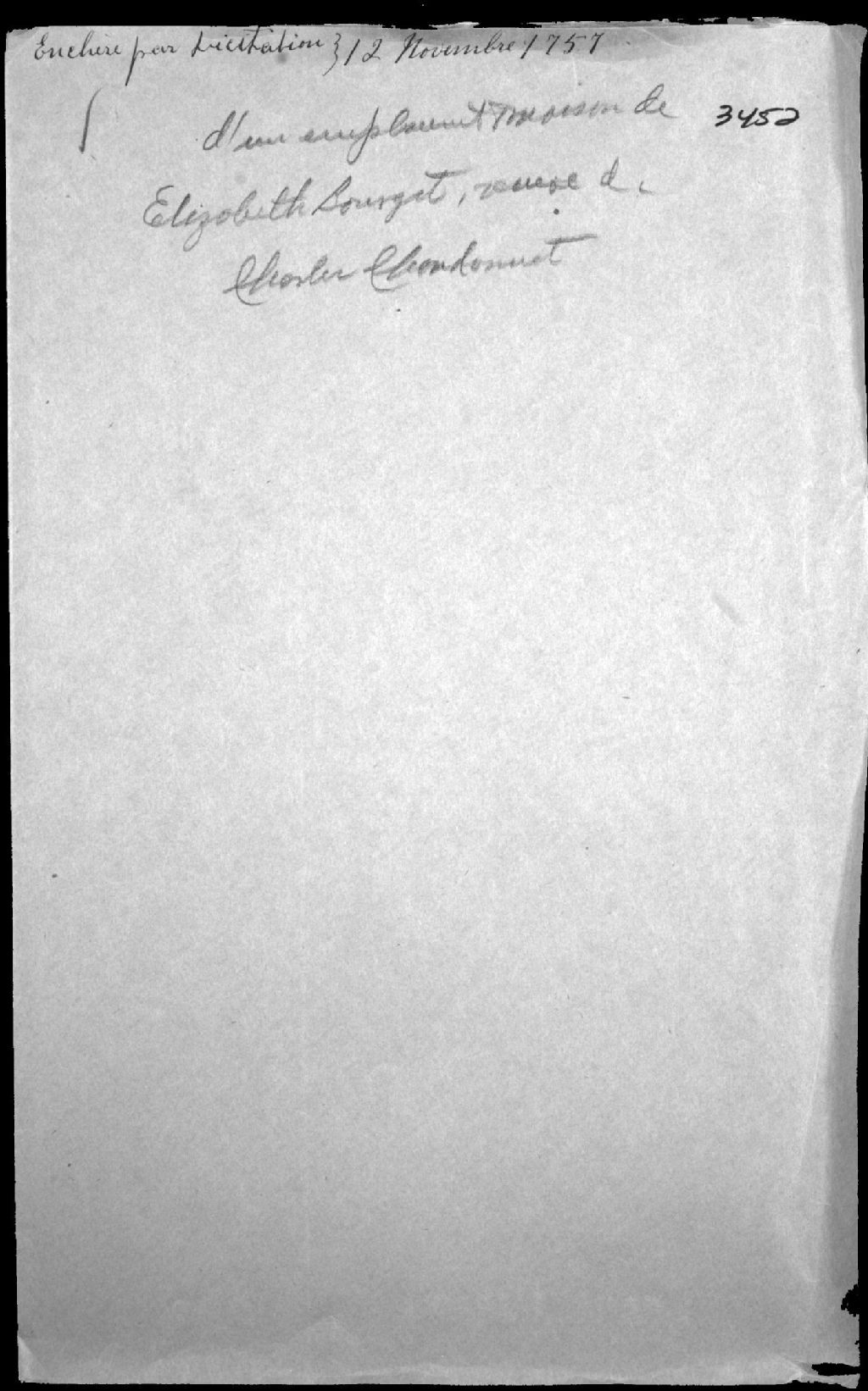 Enchère par licitation d'un emplacement et d'une maison d'Élisabeth Bourget, veuve de feu Charles Chandonnet (dit Léveillé), 12 novembre 1757, Archives nationales à Québec, Fonds Cour supérieure. District judiciaire de Québec. Tutelles et curatelles, (03Q,CC301,S1,D3452).