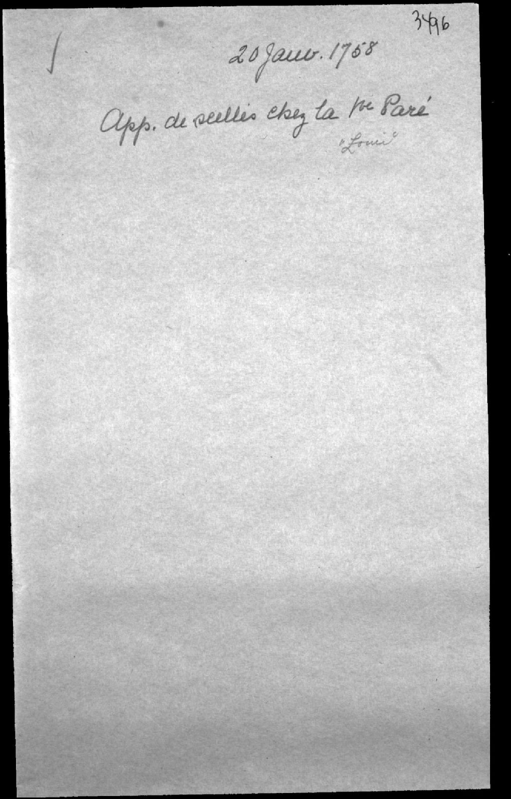 Apposition des scellés sur les biens et effets d'Agnès Poulin, veuve de feu Louis Paré, 20 janvier 1758, Archives nationales à Québec, Fonds Cour supérieure. District judiciaire de Québec. Tutelles et curatelles, (03Q,CC301,S1,D3496).