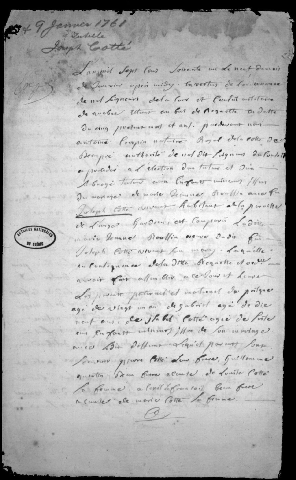 Tutelle aux mineurs de feu Joseph Côté, habitant de l'Ange-Gardien, et de Marie-Jeanne Roussin, 5 janvier 1761 - 9 janvier 1761, Archives nationales à Québec, Fonds Cour supérieure. District judiciaire de Québec. Tutelles et curatelles, (03Q,CC301,S1,D3612A).