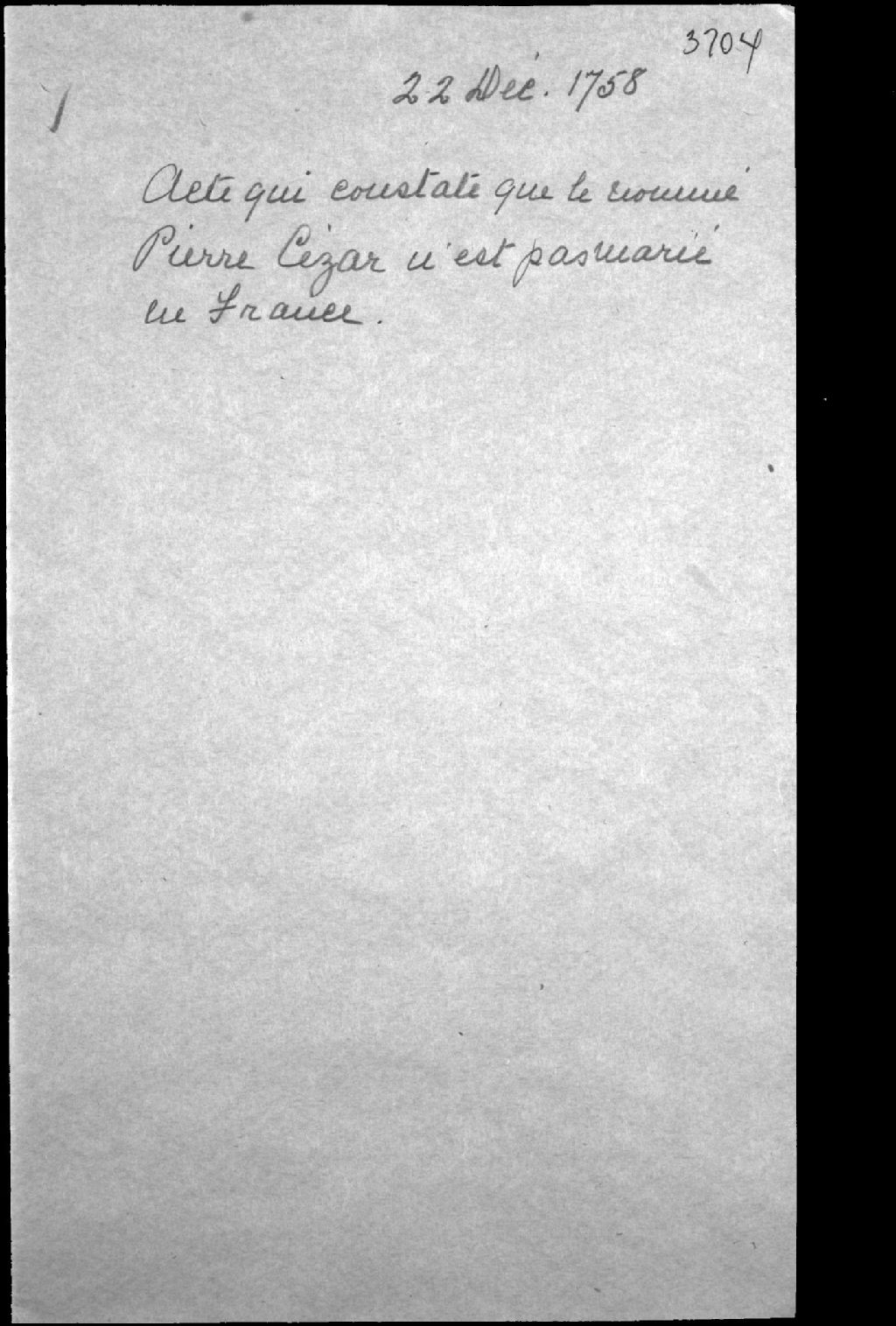 - Acte qui constate qu'il n'est pas marié en France donné en faveur de Pierre Cézar (César), natif de la région de Picardie, France