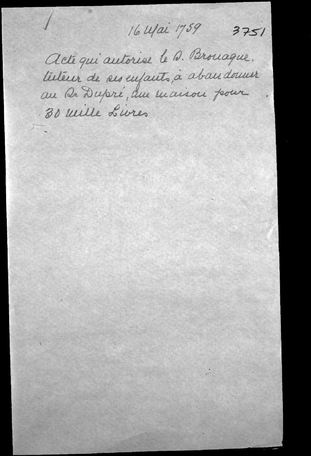 Acte qui autorise François Martel de Brouague (Berhouague), commandant pour le Roi au Labrador, tuteur de ses enfants, veuf de feue Louise Desgly (Mariauchau d'Esgly), à abandonner au sieur Dupré une maison pour 30 000 livres, 16 mai 1759, Archives nationales à Québec, Fonds Cour supérieure. District judiciaire de Québec. Tutelles et curatelles, (03Q,CC301,S1,D3751).